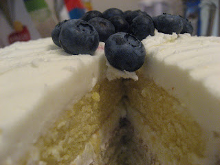 The blue eventually went on the cake, but we couldn't get it smoothed out, plus it kept cracking and tearing on us. We attempted to cover it up the worst spots with some fondant decorations and we were going to make it work, but then we moved on to the red/pink for the other layer. That fondant cracked and ripped and was a general pain in the ass too -- so we gave up and threw out both fondants. We figured that the cake would have buttercream frosting and blueberries and that would be good for our small 4th of July gathering, and it was. I'm not much of a buttercream fan, but the lemon really helped counteract the usually overly-sweet flavors of the buttercream.